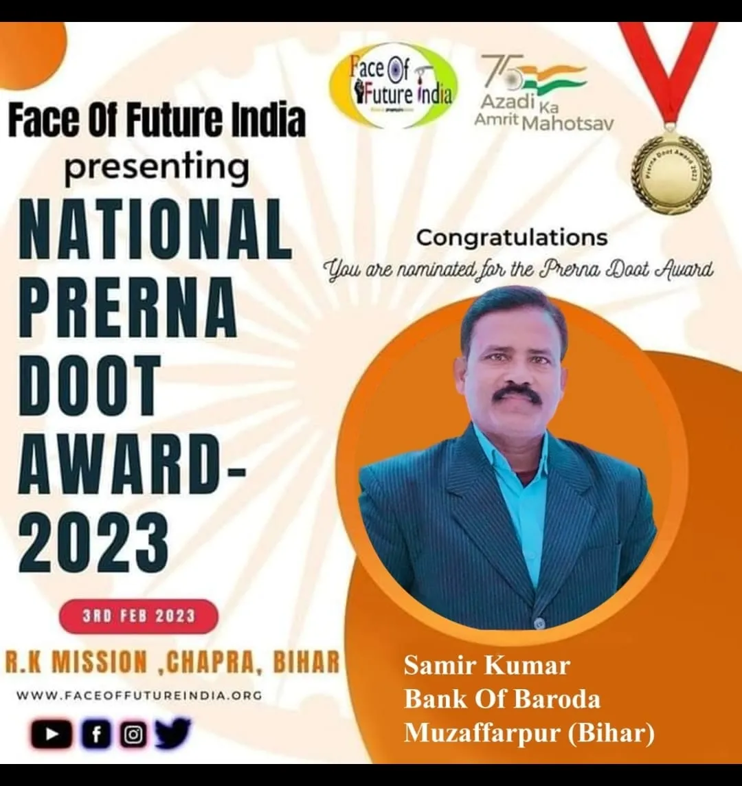 फेस औफ फ्यूचर इंडिया (FACE OF FUTURE INDIA) द्वारा राष्ट्रीय प्रेरणा दूत अवार्ड 2023 (NATIONAL PRERNA DOOT AWARD 2023) हेतु बिहार से समीर कुमार को भी नामित किया गया है। यह मुजफ्फरपुर और बिहार के लिए गर्व की बात है । यह समीर कुमार के लिये बहुत बङी उपलब्धि है । सम्पूर्ण भारत से अखिल भारतीय स्तर पर 30 लोगों (बिहार से समीर कुमार भी नामित) को ही जो समाजसेवा से जुड़े होते हैं और निस्वार्थ भाव से समाज के लिये जरूरतमंद लोगों के लिए बेहतरीन शानदार ऊत्कृष्ट कार्य करते हैं उनको यह पुरस्कार सम्मान (फेस औफ फ्यूचर इंडिया) द्वारा दिया जाता है ।